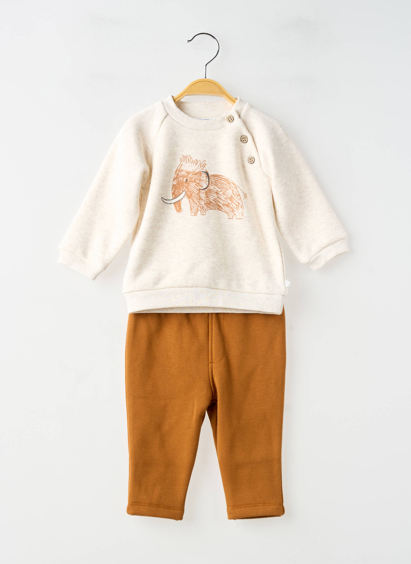 Profitez d’un vrai bon plan avec cet ensemble pantalon garçon de la marque NOUKIE'S, un choix économique sans compromis sur le style. Son haut doux couleur crème, orné d’un adorable mammouth brodé et de petits boutons sur l’épaule pour un enfilage facile, s’associe parfaitement au pantalon confortable brun camel. C’est l’ensemble idéal pour les journées actives, alliant praticité, originalité et petit prix.
