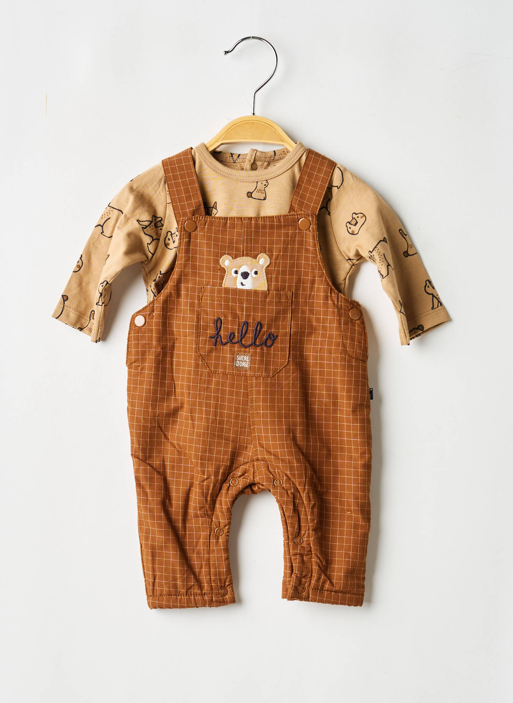 Profitez d’un super bon plan avec cet ensemble pantalon SUCRE D’ORGE pour garçon, qui allie style et petite prix. Le tee-shirt à manches longues à imprimé ours s’harmonise parfaitement avec la salopette à carreaux couleur caramel, ornée d’un ravissant motif animal brodé et du mot "hello" sur la poche avant, pour un look à la fois tendance et ludique. C’est l’occasion idéale de faire une belle économie tout en offrant à votre petit garçon une tenue à croquer, confortable et actuelle.