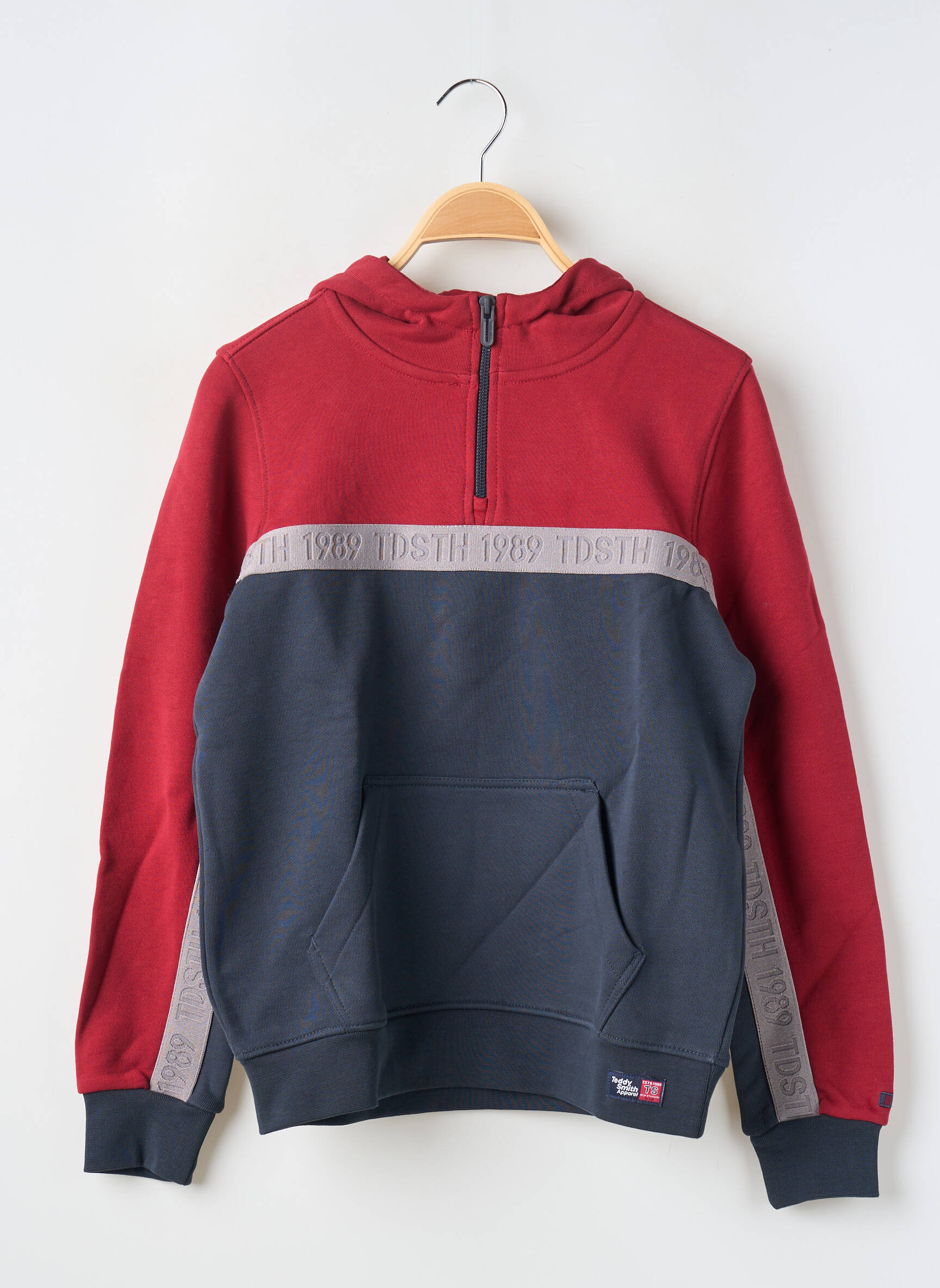 Profitez d’une vraie affaire avec ce sweat-shirt à capuche TEDDY SMITH pour garçon, idéal pour allier style et confort sans se ruiner. Ce modèle bicolore associe une teinte rouge vibrante sur le haut et les manches à un bleu foncé sur le bas, le tout rehaussé de détails gris et d’une bande siglée qui traverse la poitrine et les bras. Pratique avec sa grande poche kangourou et sa fermeture zippée montante, il saura vite devenir le favori de votre enfant pour un look tendance à petit prix.