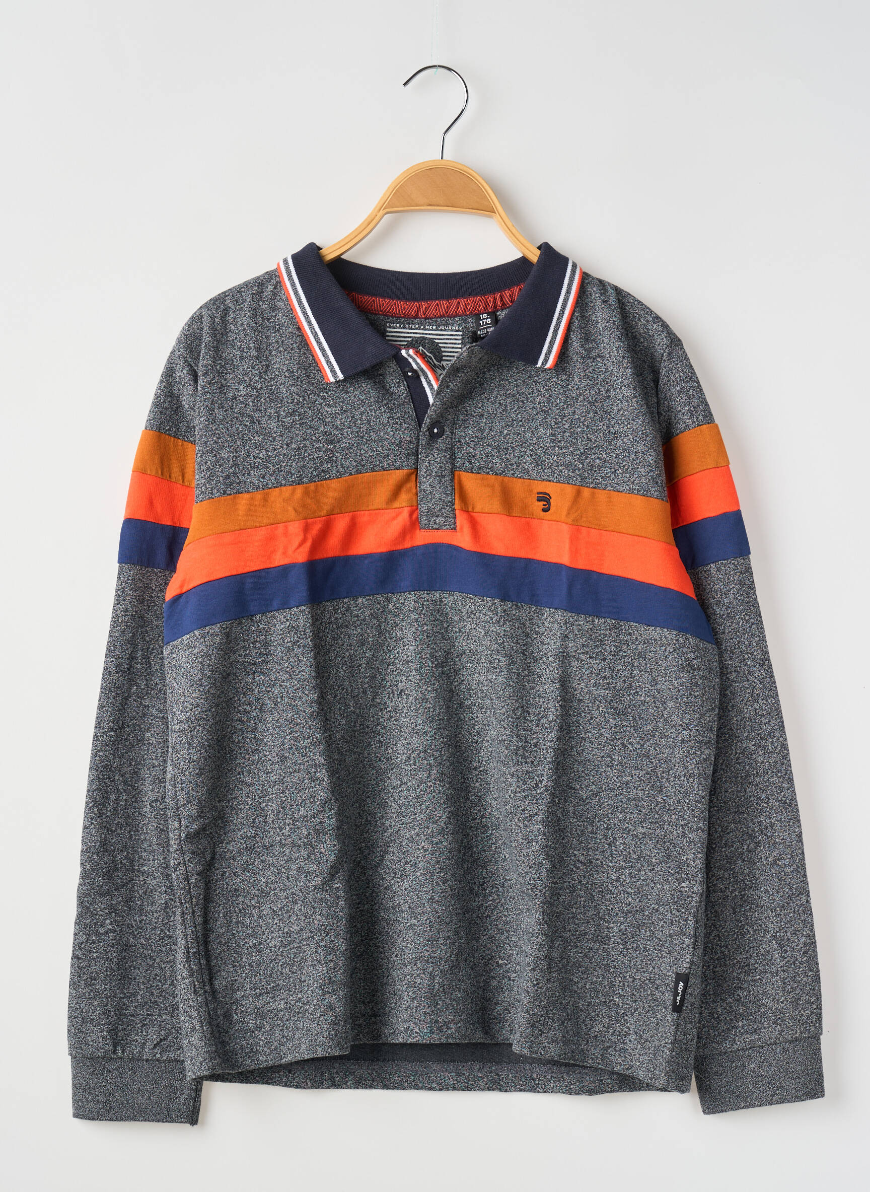 Craquez pour ce polo J&JOY pour garçon, un incontournable à petit prix qui allie style et praticité. Son coloris gris chiné est réveillé par des bandes contrastantes orange et bleu au niveau de la poitrine, tandis que le col classique à liseré bicolore apporte une touche moderne et dynamique. Ce modèle à manches longues est idéal pour accompagner toutes les tenues décontractées tout en faisant de vraies économies face au prix boutique.