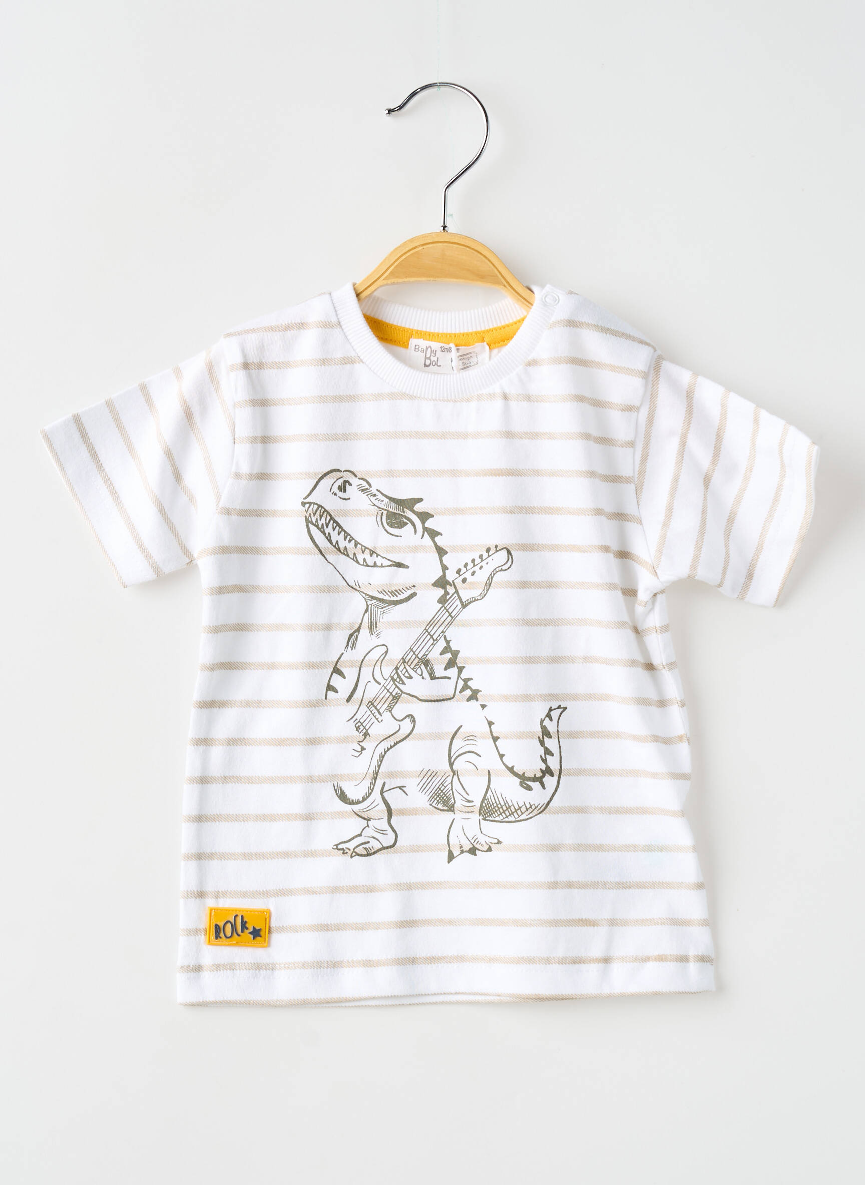 Craquez pour ce T-shirt BABY BOL à petit prix, idéal pour les petits fans de dinosaures qui veulent ajouter une touche ludique à leur tenue de tous les jours. Ce modèle affiche de fines rayures beige sur fond blanc, et se distingue par son adorable motif de dinosaure dessiné à l’avant, parfait pour faire plaisir sans se ruiner grâce à ce bon plan déstockage.