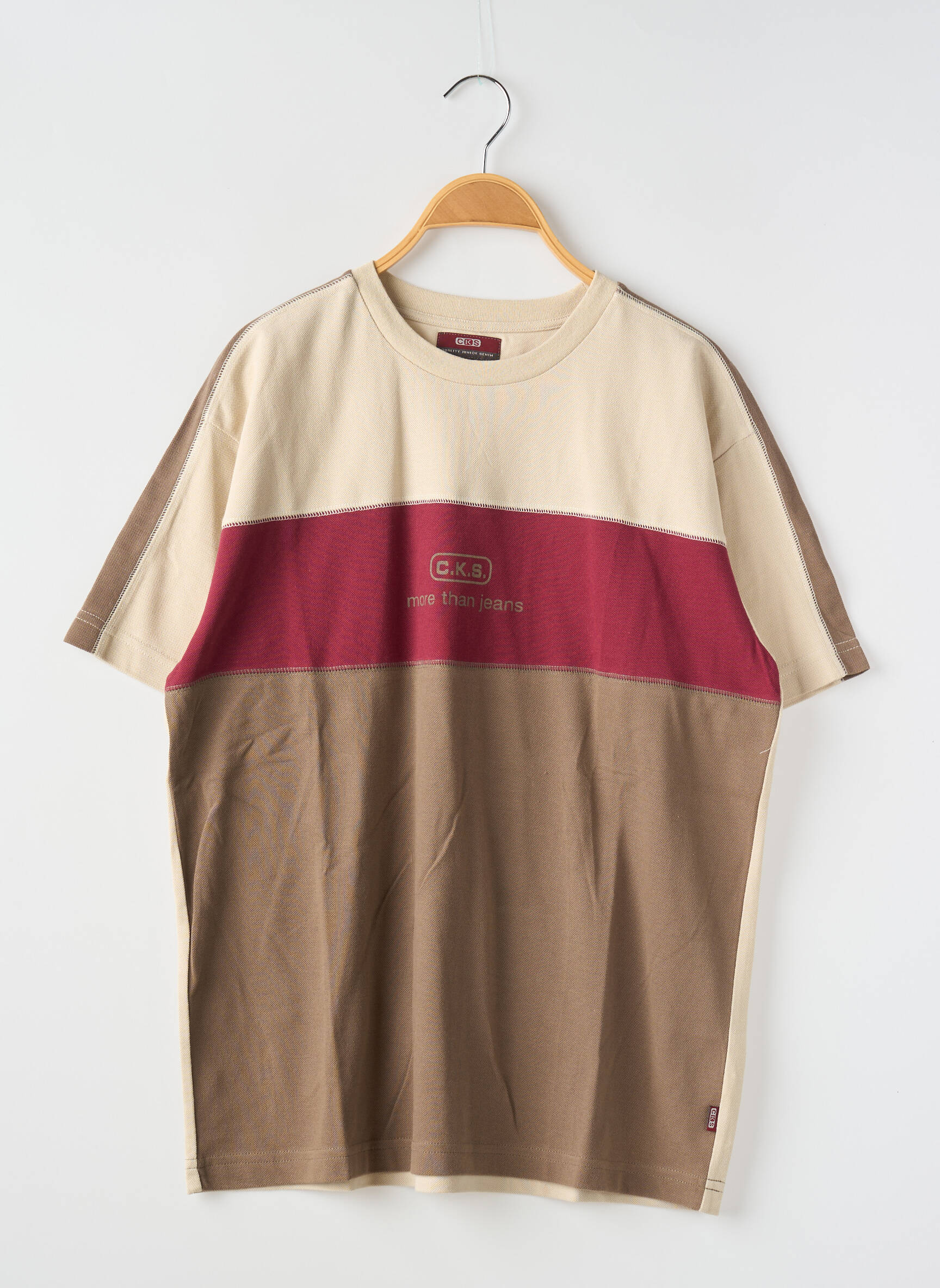 Profitez d’un super bon plan avec ce t-shirt garçon de la marque CKS, proposé à prix tout doux pour un look branché sans se ruiner. Son design original joue sur des bandes horizontales beige, bordeaux et marron, soulignées par un logo brodé au centre, pour apporter une touche à la fois moderne et décontractée qui s’accordera parfaitement à toutes les tenues du quotidien. C’est l’option idéale pour allier style et économies en toute simplicité.