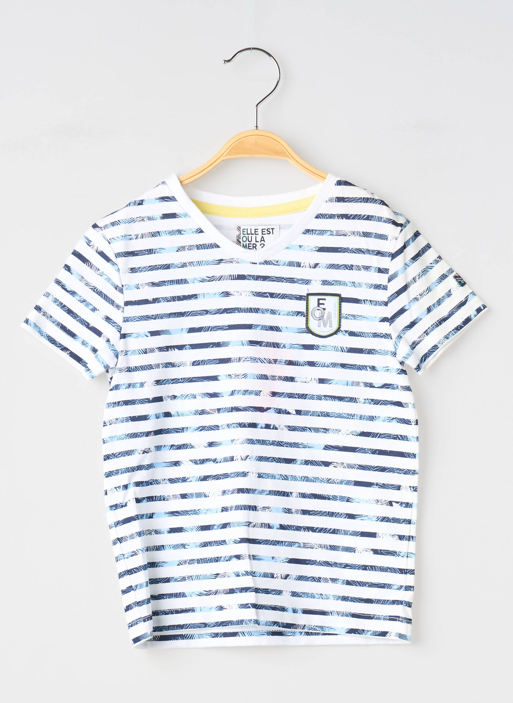 Craquez pour ce T-shirt garçon ELLE EST OU LA MER à prix mini, parfait pour profiter d’un basique tendance sans se ruiner. Avec ses rayures bleues sur fond blanc et son petit écusson sur la poitrine, il apporte une touche marine moderne idéale pour toutes les saisons, le tout à un prix vraiment avantageux.