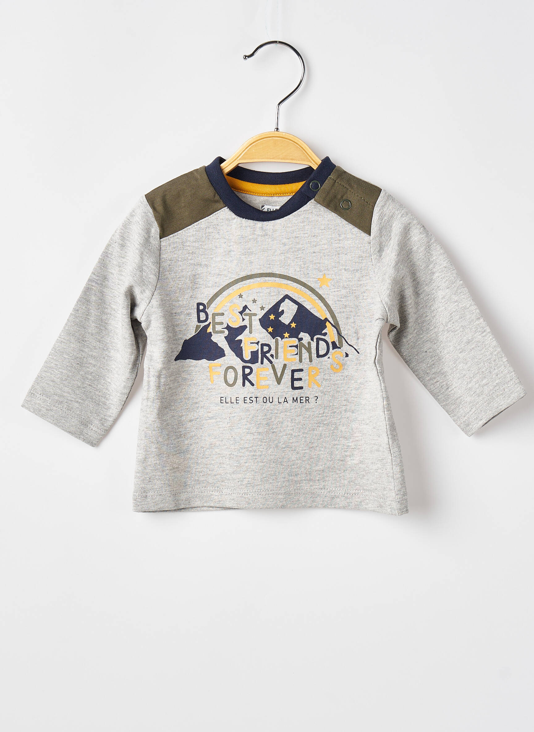Et si le meilleur ami de votre garçon était ce T-shirt signé ELLE EST OU LA MER, à la fois doux et plein d'énergie ? Ce modèle à manches longues se distingue par son gris chiné agrémenté de détails kaki aux épaules qui apportent une touche audacieuse, tandis que le col bleu marine souligne avec élégance l’encolure. Au centre, un imprimé amusant et coloré évoque l’amitié éternelle avec un message joyeux intégrant un animal marin, une invitation à l’aventure et à la complicité. Un vêtement confortable et stylé, parfait pour accompagner les explorations quotidiennes.