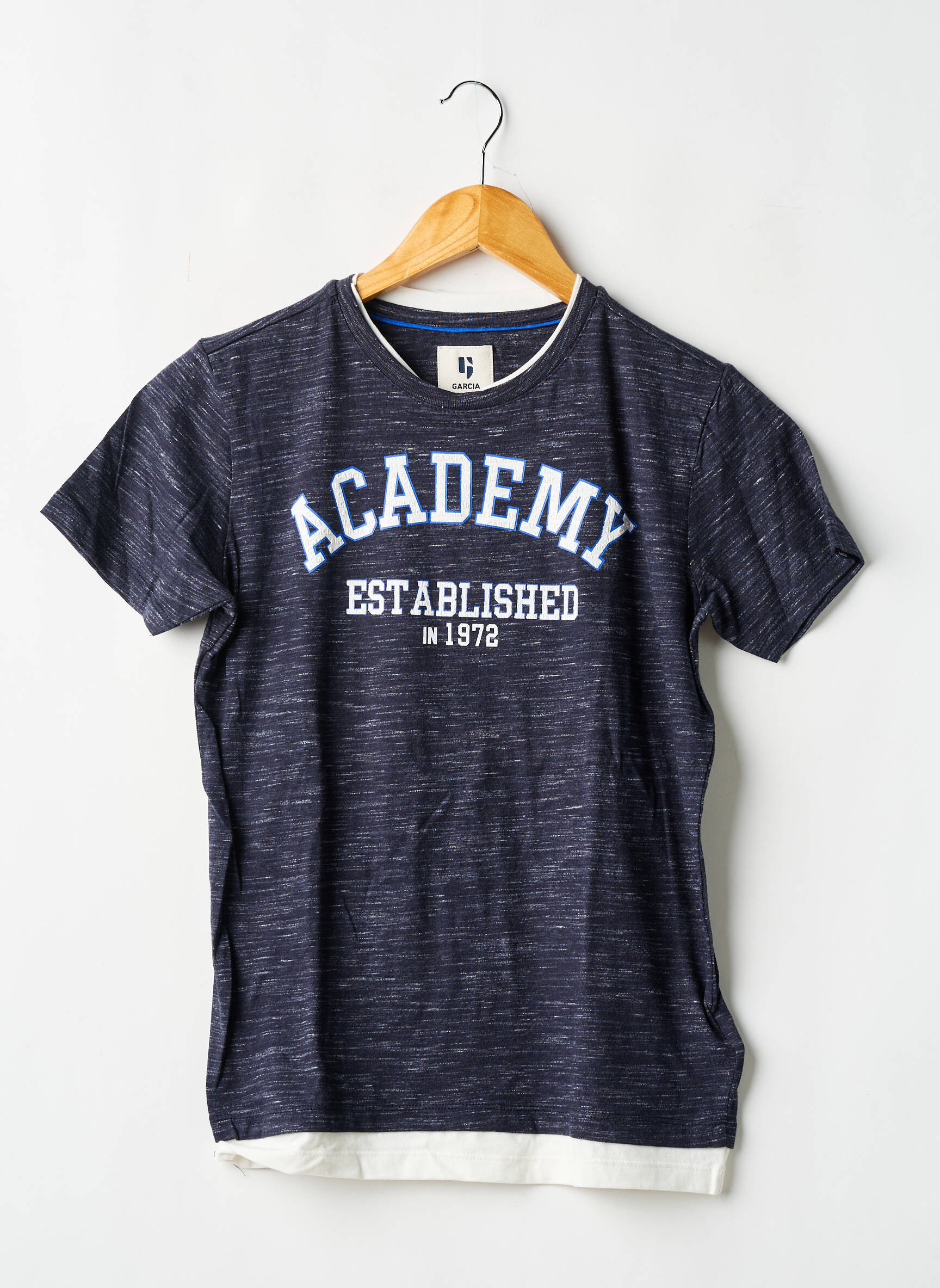 Profitez d’un vrai bon plan avec ce T-shirt GARCIA pour garçon, conçu dans un joli coton chiné bleu marine et doté d’un imprimé "ACADEMY ESTABLISHED IN 1972" façon vintage, pour un style décontracté et tendance à prix mini. Sa coupe classique et son col rond légèrement contrasté en font un indispensable facile à porter au quotidien, parfait pour renouveler la garde-robe de votre enfant sans vous ruiner.