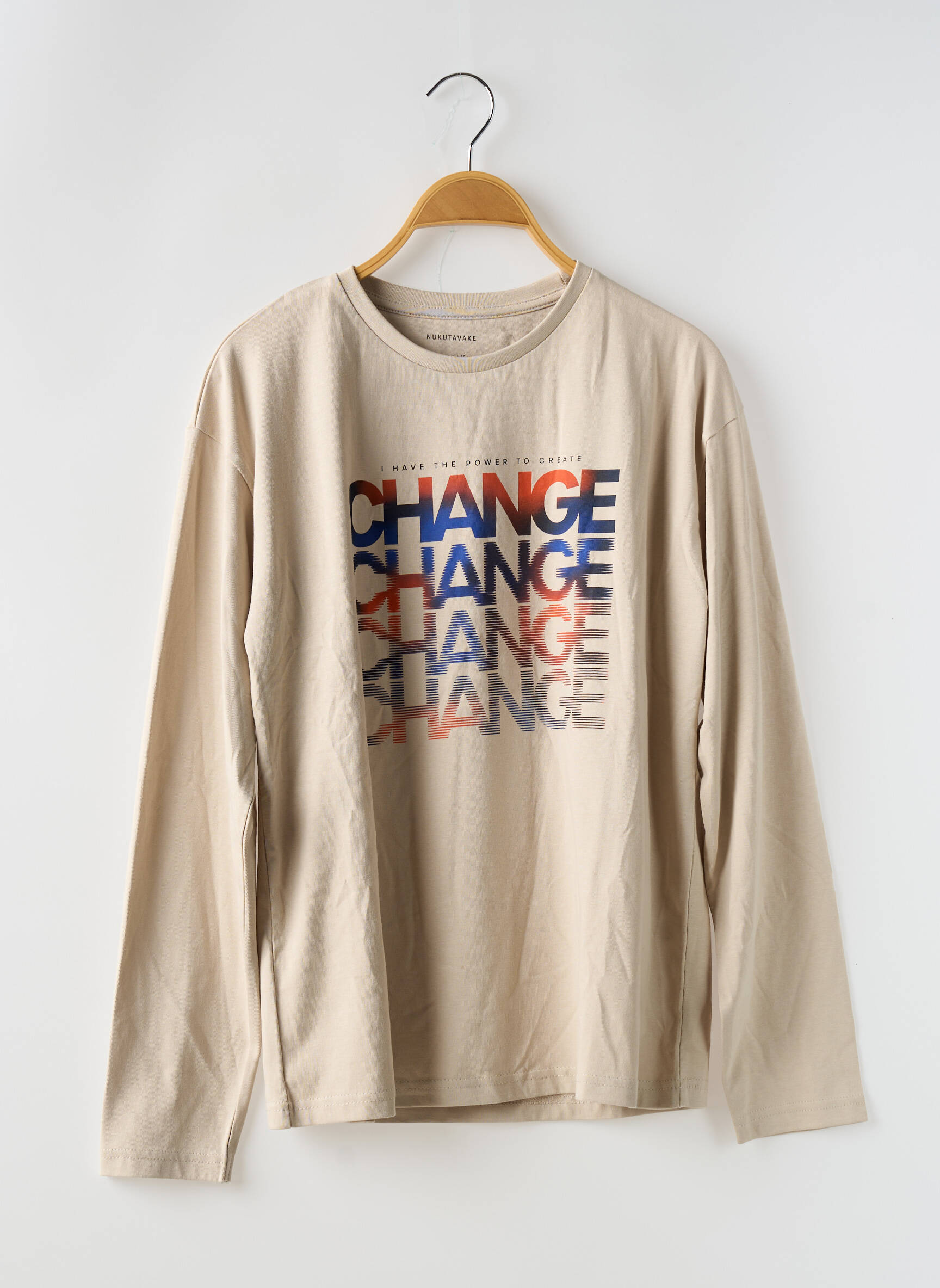 Voici le T-shirt à manches longues pour garçon de la marque NUKUTAVAKE, une pièce tendance à petit prix qui ne sacrifie pas le style pour autant. Son coloris beige facile à assortir est mis en valeur par un motif graphique moderne au centre, affichant le mot "CHANGE" répété en différentes couleurs. Idéal pour renouveler le dressing à moindre coût, ce T-shirt combine confort, style urbain et économie pour un achat malin.