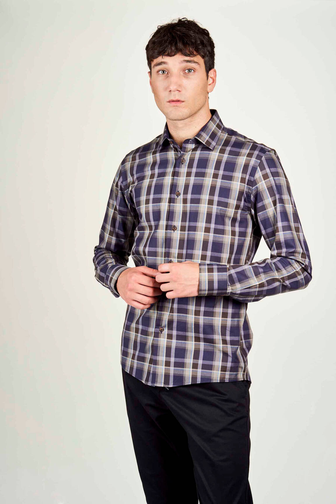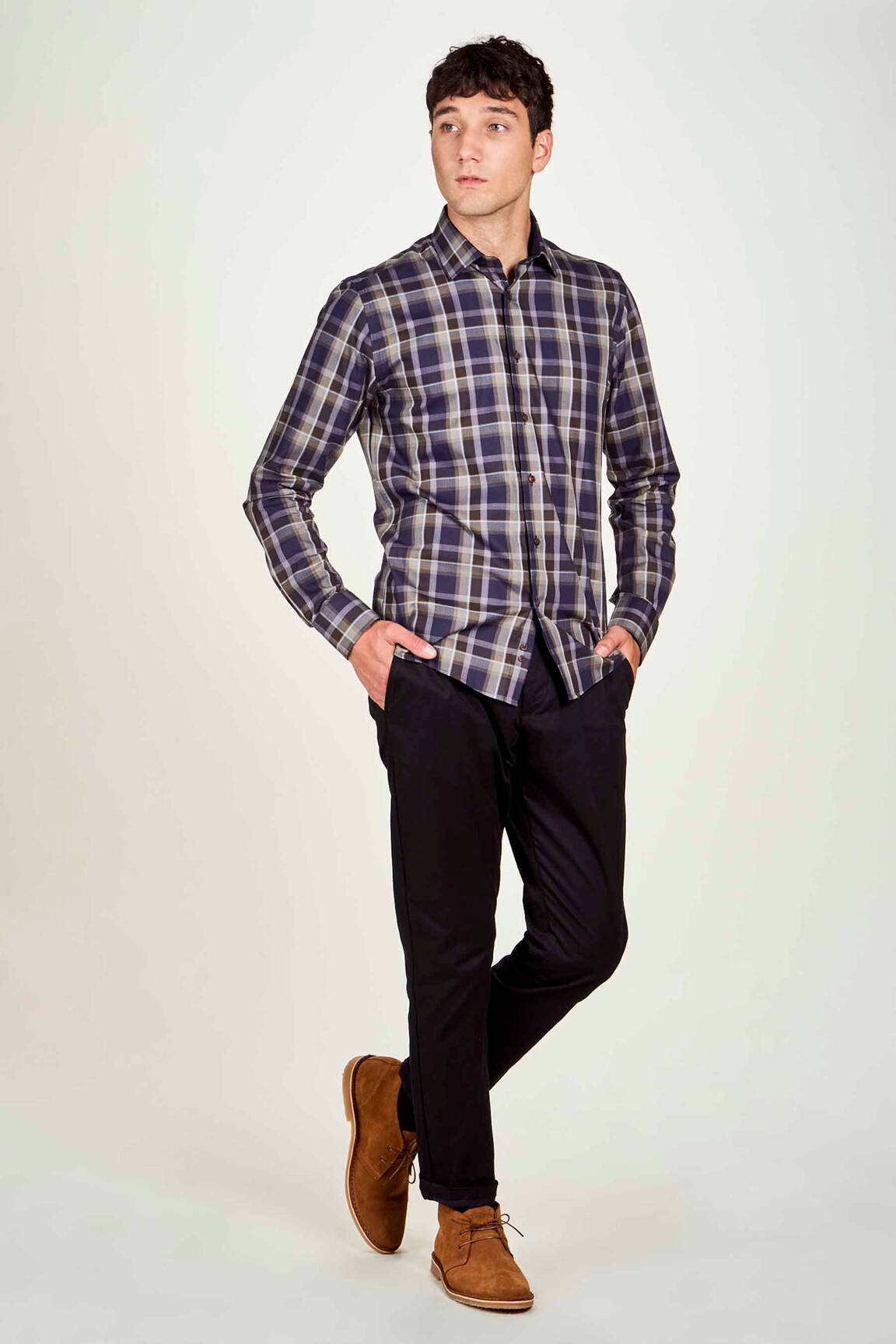 Pour une allure décontractée mais chic, associez cette chemise à un pantalon noir ajusté pour une base élégante. Pour un look de weekend, optez pour un jean brut, qui apportera une touche de simplicité tout en complétant le motif à carreaux de la chemise. En termes de chaussures, des derbies en cuir marron ou des baskets blanches peuvent parfaitement rehausser l’ensemble. Pour les journées plus fraîches, un blazer dans des tons neutres pourrait être ajouté, tout en gardant un équilibre entre le style formel et informel. N’oubliez pas d’accessoiriser avec une montre sobre pour une touche finale raffiné.