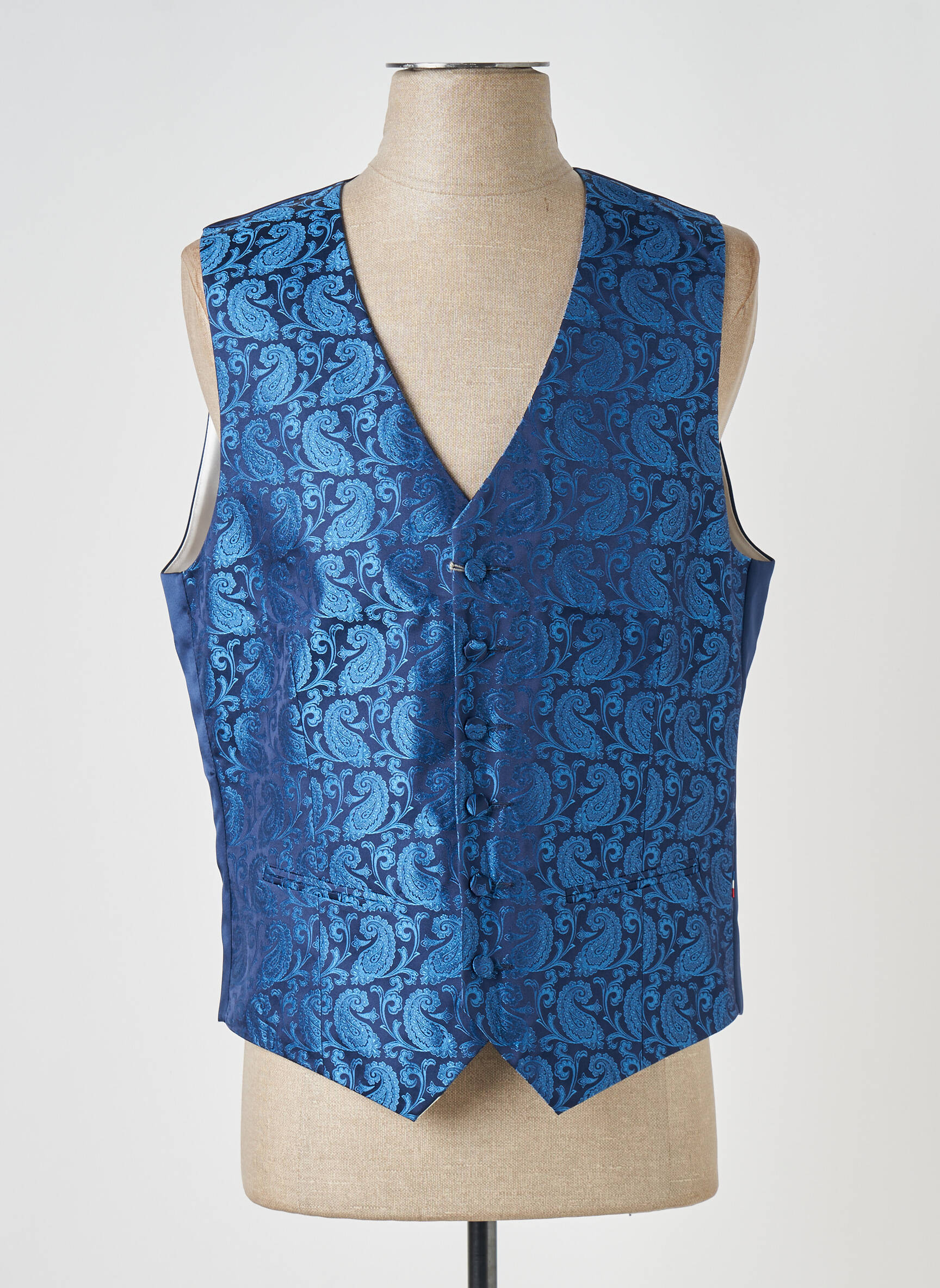 Ce gilet s’associe facilement avec une chemise blanche ou claire pour mettre en valeur ses reflets et son motif, et se marie parfaitement avec un pantalon de costume foncé ou un jean brut pour un look plus décontracté. Pour compléter l’ensemble, une paire de chaussures habillées ou des mocassins seront idéals, et il suffit d’ajouter une montre élégante ou une pochette discrète pour une touche finale soignée lors d’un événement ou d’une soirée.