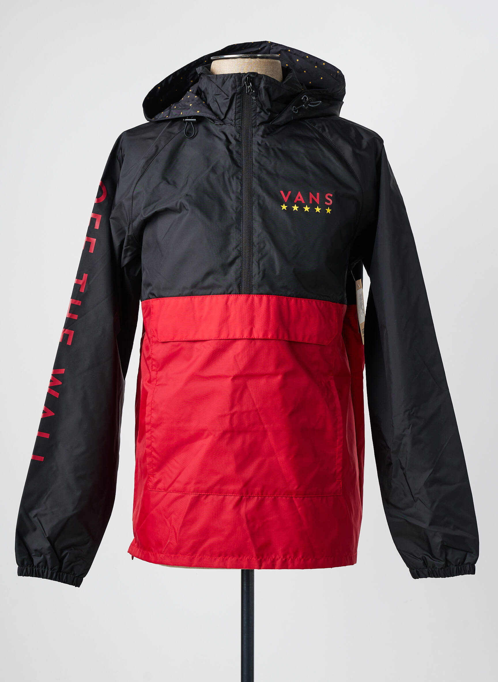 Ce coupe-vent pour homme signé VANS est la pièce idéale pour affronter le vent et la pluie tout en affichant un look urbain à prix mini. Avec son design bicolore noir et rouge, il assure un style tendance et reconnaissable grâce à l’inscription "Off The Wall" sur la manche et le logo brodé sur la poitrine, tandis que la grande poche frontale et la capuche renforcent sa praticité. Profitez de ce bon plan pour vous offrir un essentiel streetwear sans faire exploser votre budget.