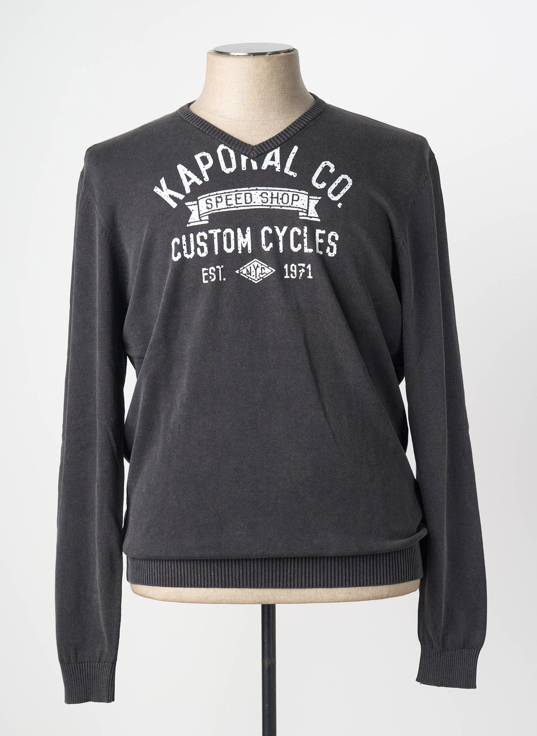 Profitez d’un vrai bon plan avec ce pull Kaporal pour homme qui allie style tendance et petit prix. On aime son coloris sobre et l’imprimé vintage “Custom Cycles” qui apporte une touche urbaine et décontractée à votre look. Le col en V souligne la silhouette tout en offrant un confort au quotidien. C’est le choix parfait pour un dressing moderne sans se ruiner.