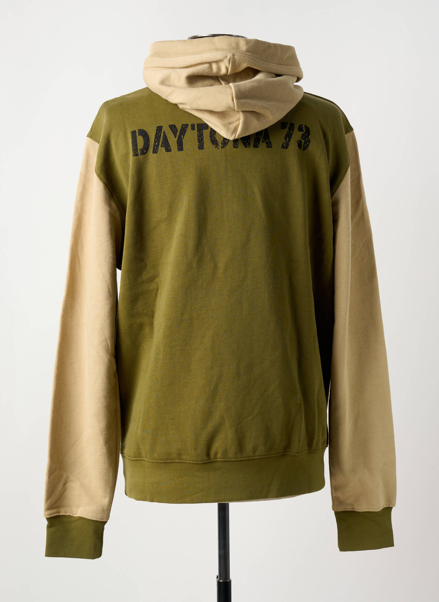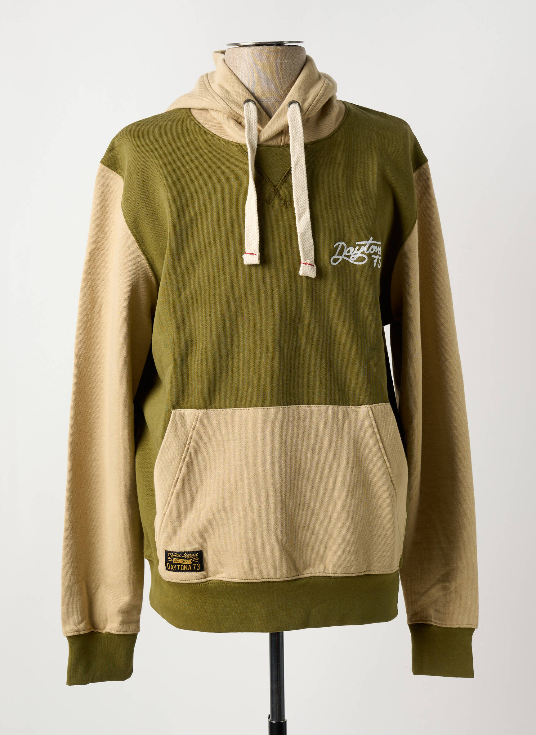 Profitez d'une opportunité à ne pas manquer avec ce sweat-shirt à capuche DAYTONA pour homme, parfait pour ceux qui cherchent à allier style, confort et petit prix. Ce modèle bicolore associe un vert kaki profond et un beige doux pour un résultat moderne et casual, idéal aussi bien pour les journées détente que pour vos sorties. Sa grande poche kangourou et ses détails sur la capuche apportent une touche pratique et tendance, tandis que le logo brodé sur la poitrine rappelle subtilement l’identité de la marque. C’est l’occasion idéale de se faire plaisir sans se ruiner avec un sweat confortable et stylé, signé DAYTONA.