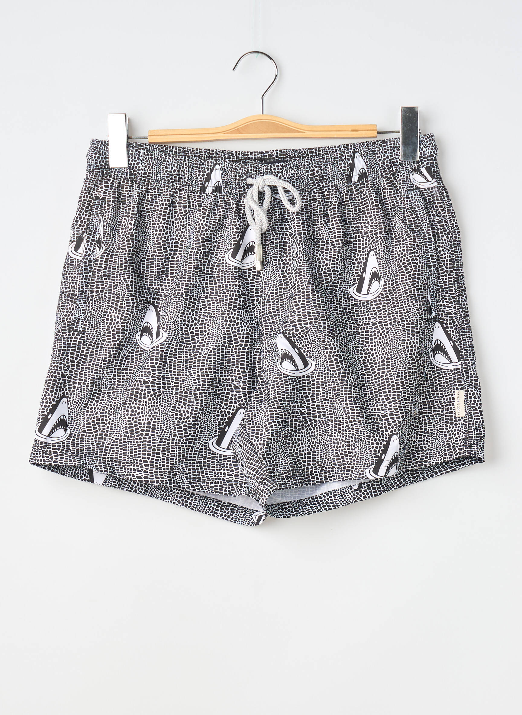 Profitez d’un bon plan mode avec ce short pour homme signé BRUCE & BUTLER, parfait pour afficher un style original sans se ruiner. Son imprimé graphique noir et blanc rehaussé de motifs requin apporte une touche de fun à toutes vos tenues décontractées. Doté d’une taille élastique ajustable par cordon, il offre un confort idéal au quotidien. C’est l’occasion rêvée de vous faire plaisir avec une pièce tendance à petit prix, à ne pas laisser passer !