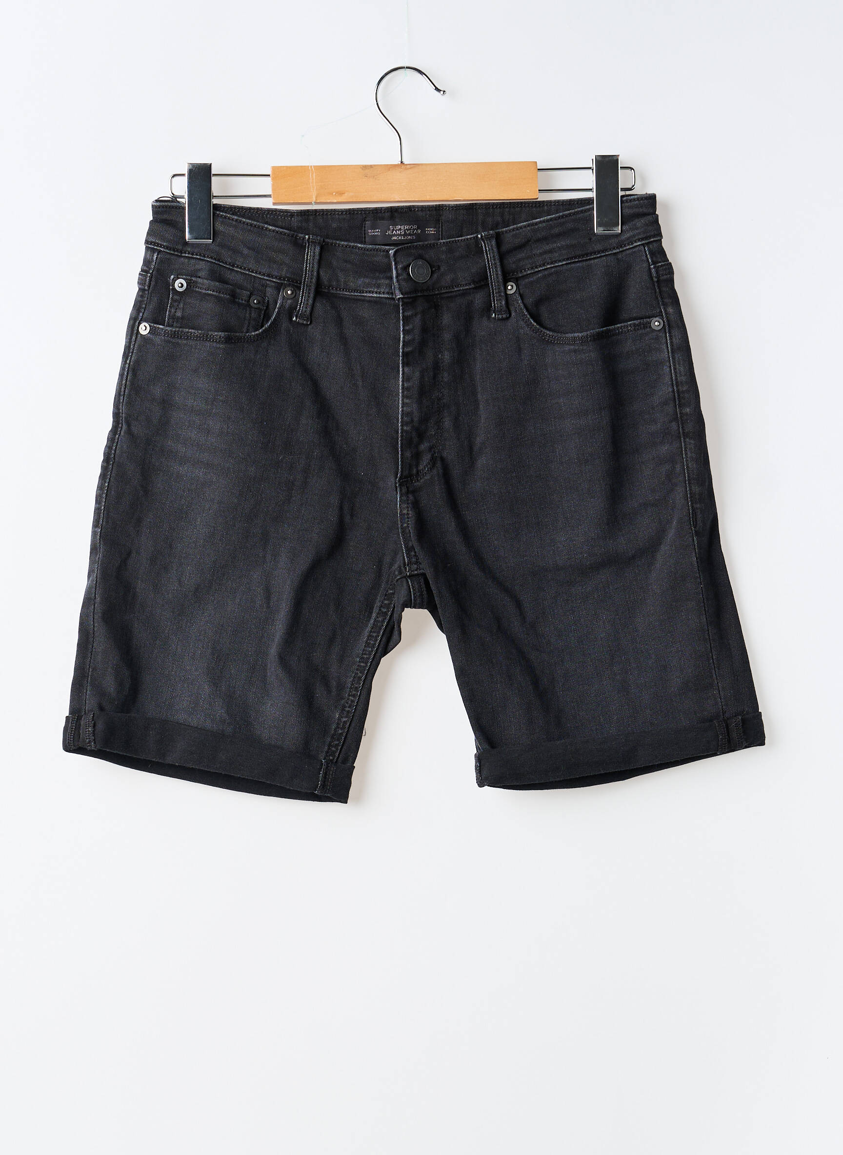Profitez d’une belle opportunité pour compléter votre dressing à petit prix avec ce short en jean noir de la marque JACK & JONES qui allie style urbain et confort, parfait pour un look moderne et décontracté sans se ruiner. Ce modèle présente une coupe classique avec cinq poches, une finition légèrement délavée et un revers discret, idéal pour s'adapter à toutes vos envies estivales tout en faisant des économies.