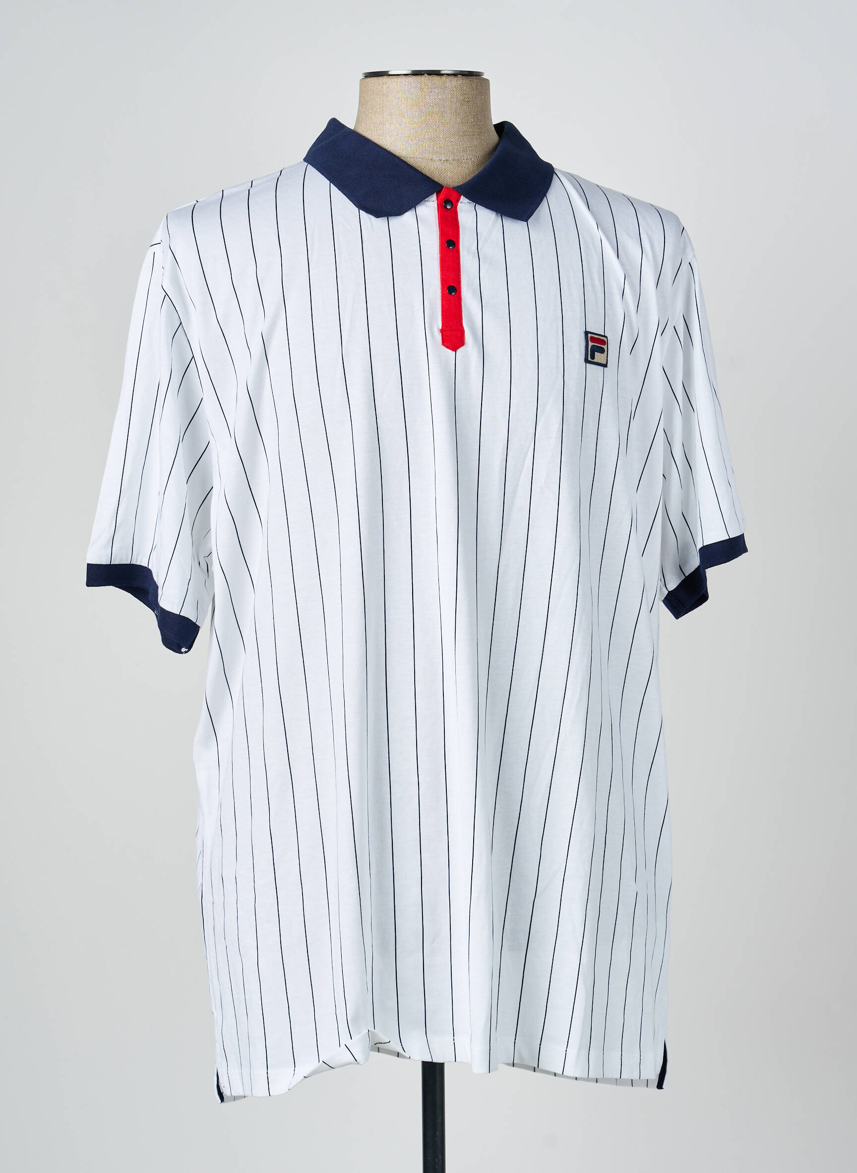 Profitez d’un incroyable bon plan avec ce polo FILA pour homme, parfait pour ceux qui souhaitent compléter leur dressing à petit prix sans faire de compromis sur le style. Ce modèle arbore de fines rayures verticales sur un fond blanc, un col contrastant bleu marine ainsi qu’une patte de boutonnage rouge qui apporte une touche originale. Le logo discret FILA brodé sur la poitrine signe une allure sportive et tendance, idéale pour un look casual ou urbain.