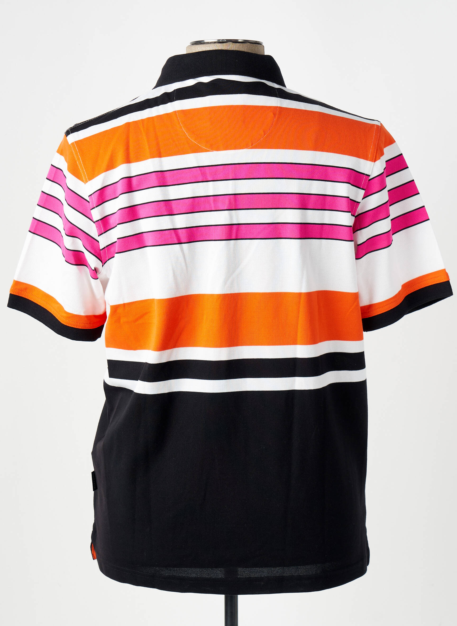 Profitez d’un style unique à prix mini avec ce polo pour homme signé HAJO, un incontournable pour ceux qui veulent allier look moderne et petits prix. Son design audacieux se distingue par des rayures horizontales colorées mêlant l'orange, le noir, le rose et le blanc pour un contraste dynamique qui dynamise vos tenues au quotidien. On retrouve une patte de boutonnage classique, un col noir élégant et une petite poche poitrine ornée du logo discret de la marque pour la touche finale. C'est le bon plan parfait pour renouveler votre garde-robe sans vous ruiner.