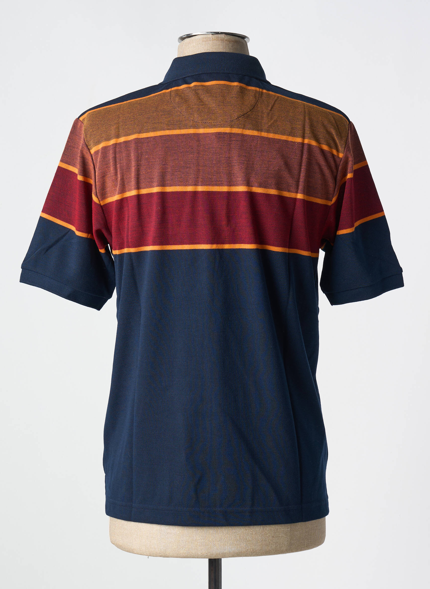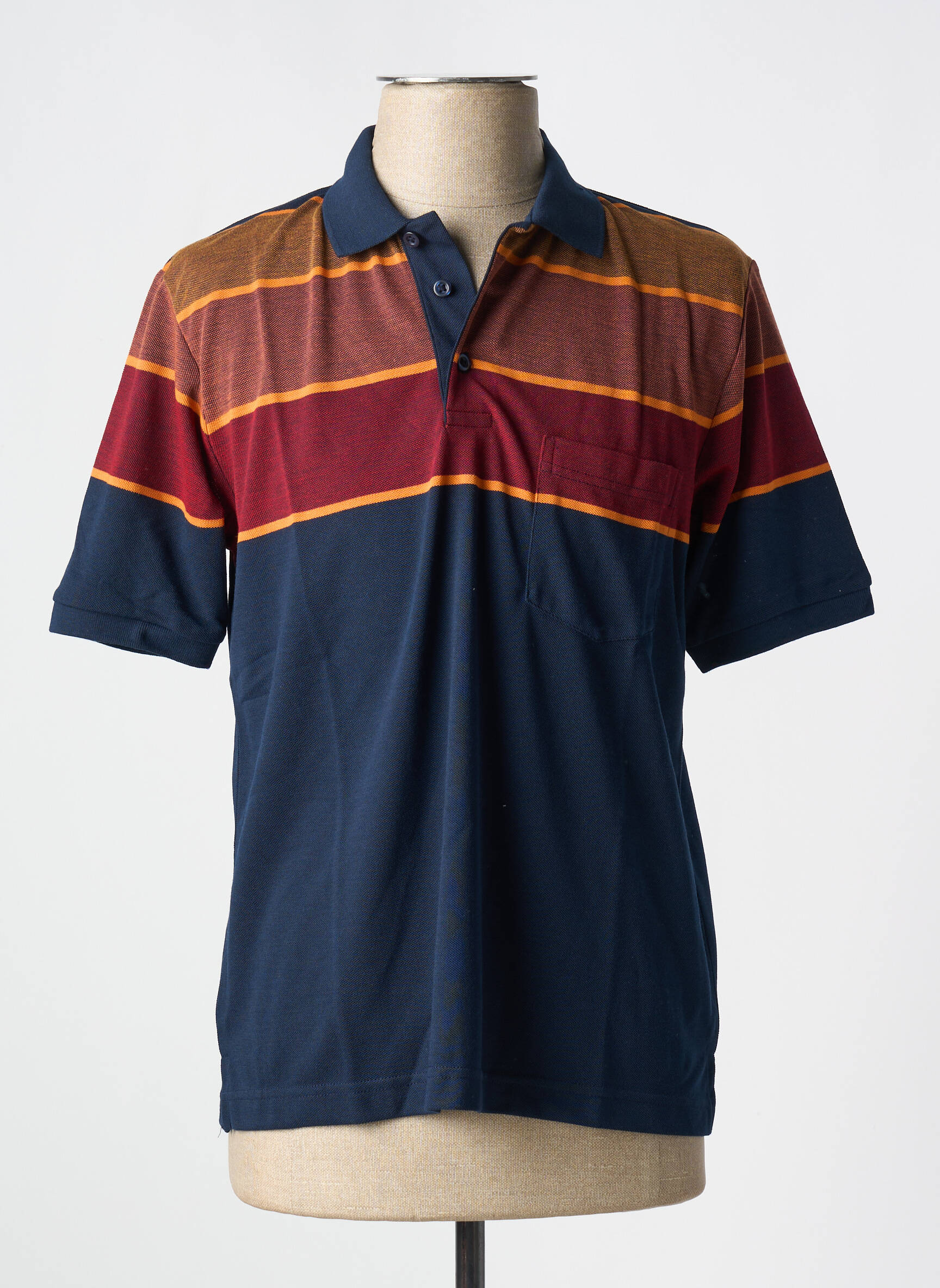 Profitez d’un bon plan avec ce polo pour homme signé LOUIS VICTOR, qui allie élégance et décontraction à prix mini. Son design moderne met en valeur un jeu de bandes horizontales aux teintes chaudes, associant le bordeaux, le marron et l’orange sur le haut, contrastant parfaitement avec le bleu marine uni sur le reste du vêtement. Sa coupe classique avec col polo boutonné et poche discrète à la poitrine en fait un incontournable du vestiaire masculin, parfait pour se démarquer sans se ruiner.