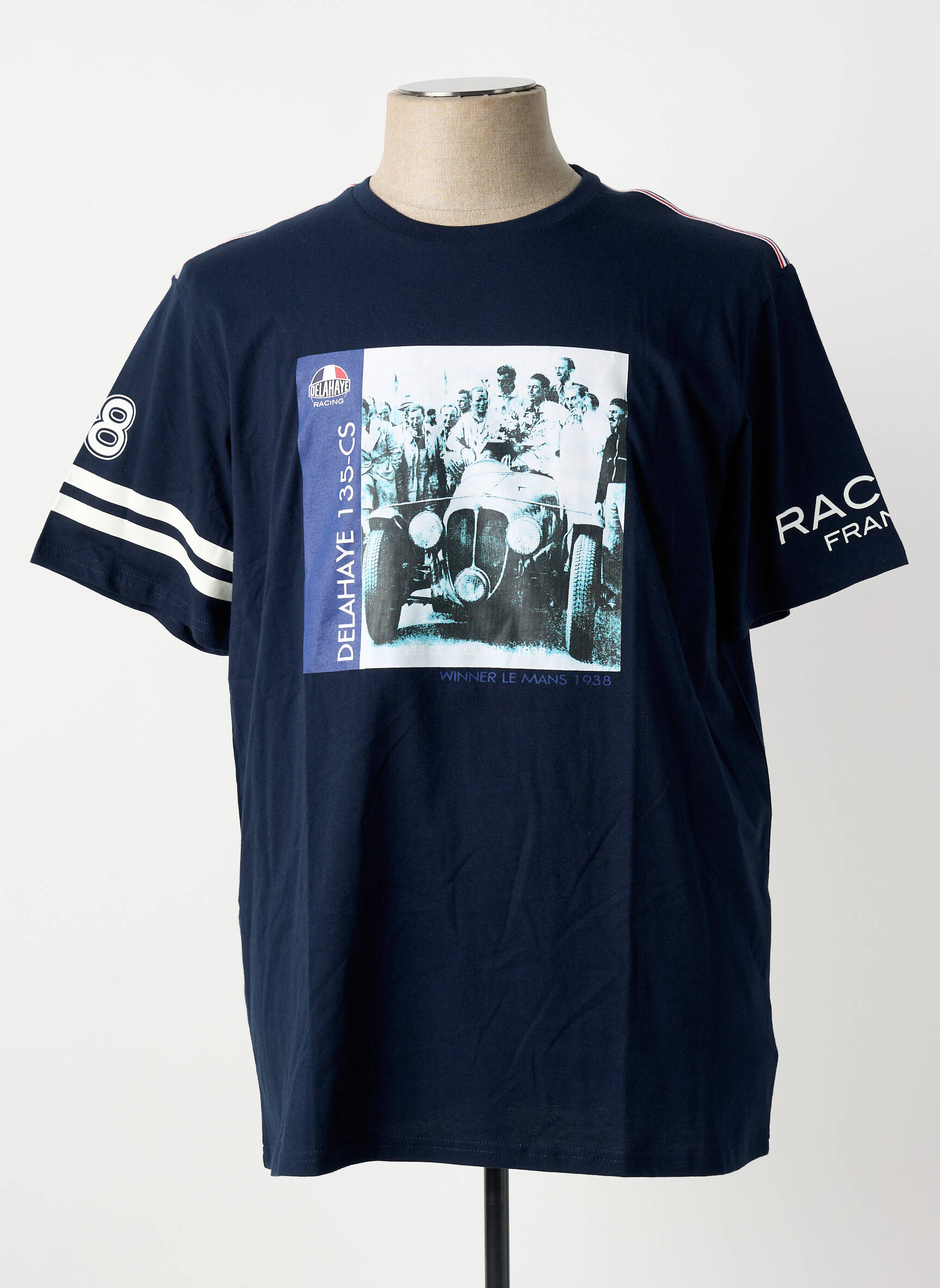 Profitez d’une vraie affaire avec ce T-shirt DELAHAYE pour homme, proposé à prix mini tout en vous offrant un look vintage et sportif. Affichant fièrement un imprimé inspiré de l’univers automobile, ce modèle bleu marine se distingue par ses motifs en hommage aux grandes heures de la course, ses manches ornées de bandes blanches ainsi que ses détails chiffrés et lettrages contrastés. C’est la pièce idéale pour donner une touche rétro à vos tenues sans vous ruiner.