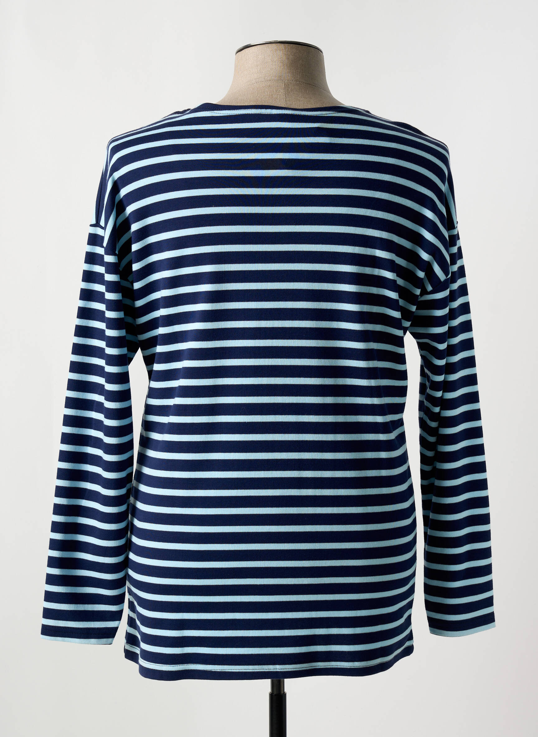 Ce T-shirt se porte idéalement avec un jean brut ou un pantalon chino clair pour un look décontracté mais soigné. Il se marie parfaitement avec une veste en jean ou un blouson léger pour les soirées un peu fraîches, et s'accorde sans effort avec des sneakers blanches ou des chaussures bateau pour renforcer cette allure revisitée du style marin. Pour une touche plus contemporaine, on peut aussi le glisser sous un pull en maille fine en laissant apparaître subtilement les rayures au niveau du col et des manches.