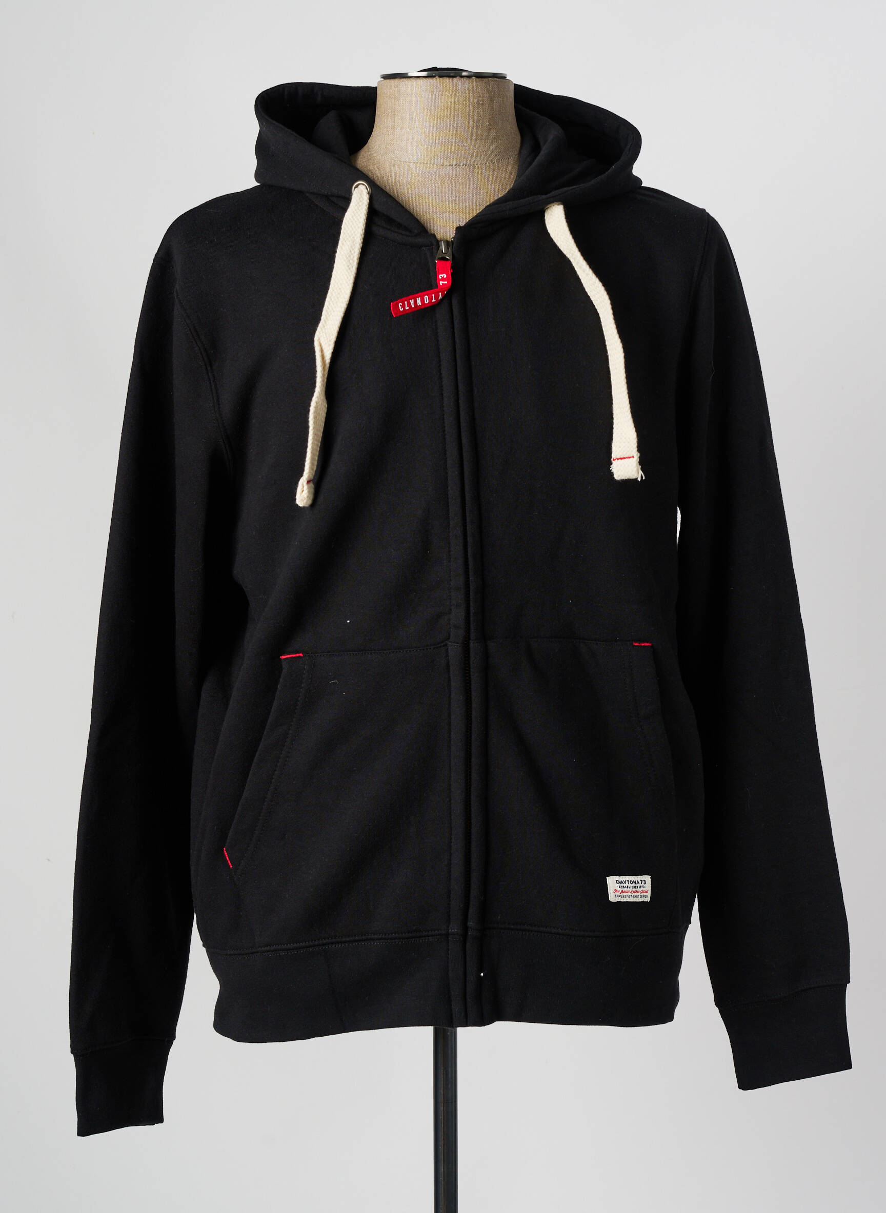 Profitez d'un bon plan avec cette veste casual DAYTONA pour homme, parfaite pour compléter une tenue décontractée à petit prix. Son design noir intemporel est rehaussé de cordons contrastés à la capuche et de touches rouges discrètes sur les poches, le tout avec une fermeture zippée pratique et deux poches avant pour ajouter du confort au quotidien. C'est l'occasion idéale de vous offrir une pièce stylée à prix réduit sans compromis sur le look.